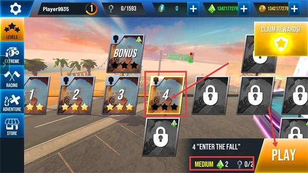 1、选择第4关【Enter-the-Fall】,难度设为【Medium】,消耗2颗绿钻后点击【PLAY】按钮开启挑战,逐步积累关卡进度。