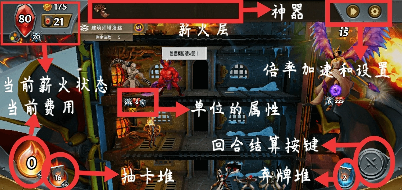 5.左上角会有一个“剩余波数”,所指的是距离Boss出场的剩余回合。一整局游戏共有8次对战,五次普通关卡里的Boss会在最后回合出现,三次高难关里的Boss会在一开局就出现,并且可以被攻击。每一局对战只有Boss或者“薪火”死亡才会结束。