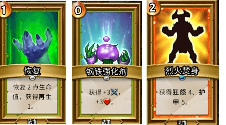 下面是三张效果不同的法术牌,分别是治疗卡、基础属性(攻击力和血量)强化卡和增益卡。