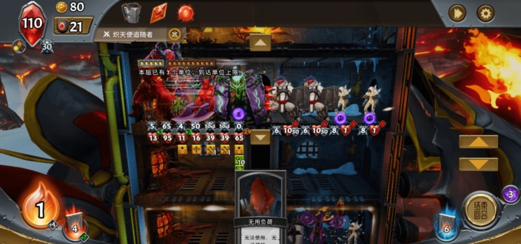 玩法也很简单,从底层开始出怪,每个回合结束后如果怪物存活,就会移动到上一层,直到顶层开始与“薪火”展开决斗。而玩家只能在下面三层里使用卡牌,阻挡敌人对“薪火”的攻击。每个回合结束后,同一层的双方会进行一轮回合制的攻击,存活的敌人会走向上一层,直到顶层与“薪火”展开生死战,若“薪火”死亡则整局游戏结束。