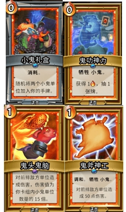 对高血量的前排可以使用“鬼头鬼脑”或者“鬼斧神工”造成高额伤害,“小鬼盲盒”用来补充卡牌数量。