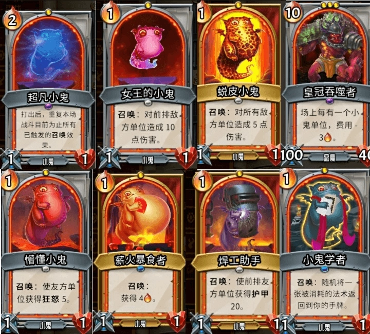 “小鬼回收”保证每个回合都有“小鬼”卡使用,“死者骨灰”让“小鬼”卡的召唤能力多触发一次,“女王之尾”可以提供卡牌抽取和回费(作用不大),“永恒之火”-2费后所有“小鬼”卡随便释放,不卡手。