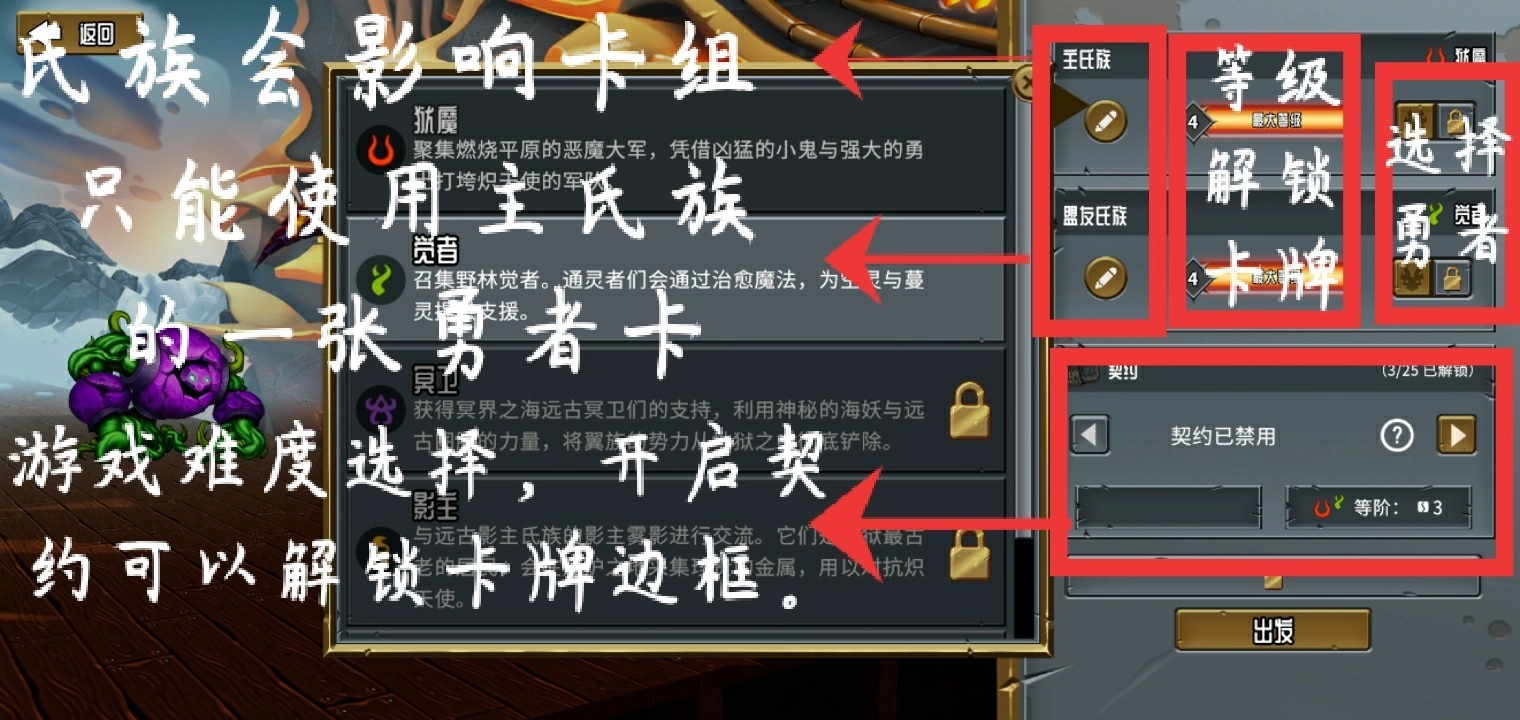 玩家所使用的卡牌分为单位卡和法术卡俩大类型,单位卡中又分出了勇者卡和非勇者卡,每一局游戏里只能使用主氏族的勇者牌。勇者牌的升级方式是独立的、不同于普通的单位牌,它无法在商店里进行升级,只能通关一次大BOSS关卡才能进行一次升级,而升级方面又分为三个方向,这三个升级方向互不相同,对游戏同样有很大的影响。方向对了,与卡组互相贴合,就可以拥有很强的战斗实力,反之亦然。所以,勇者卡的升级方向基本决定了卡组流派的强弱。