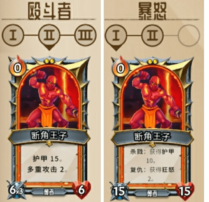 身为勇者卡的“断角王子”,其升级路线为Ⅱ级“殴斗者”(多重攻击+2)和Ⅰ级“暴怒”(击杀敌人获得护甲用于续航,挨打“复仇”增加狂怒)。