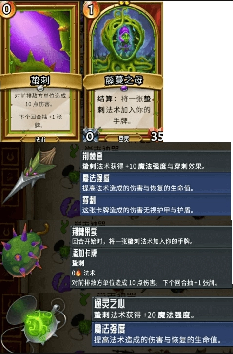 “蛰刺”——0费10伤还增加下一次的抽卡数量,可谓非常牛批的一张法术卡。在三个神器的加持下,即便是每个回合制造的“蛰刺”也拥有40点穿透伤害。每个回合又能多获得俩张,需要注意的是,加入手牌里的“蛰刺”不会消失,而是进入弃牌堆里,也就是说——“蛰刺”完全可以占领你的卡组,一个回合抽取最高数量(10张)的卡牌完全不在话下,10张卡牌里有大概5~8张“蛰刺”,也就是说一个回合就能打出200~320点穿刺伤害,输出非常可观。