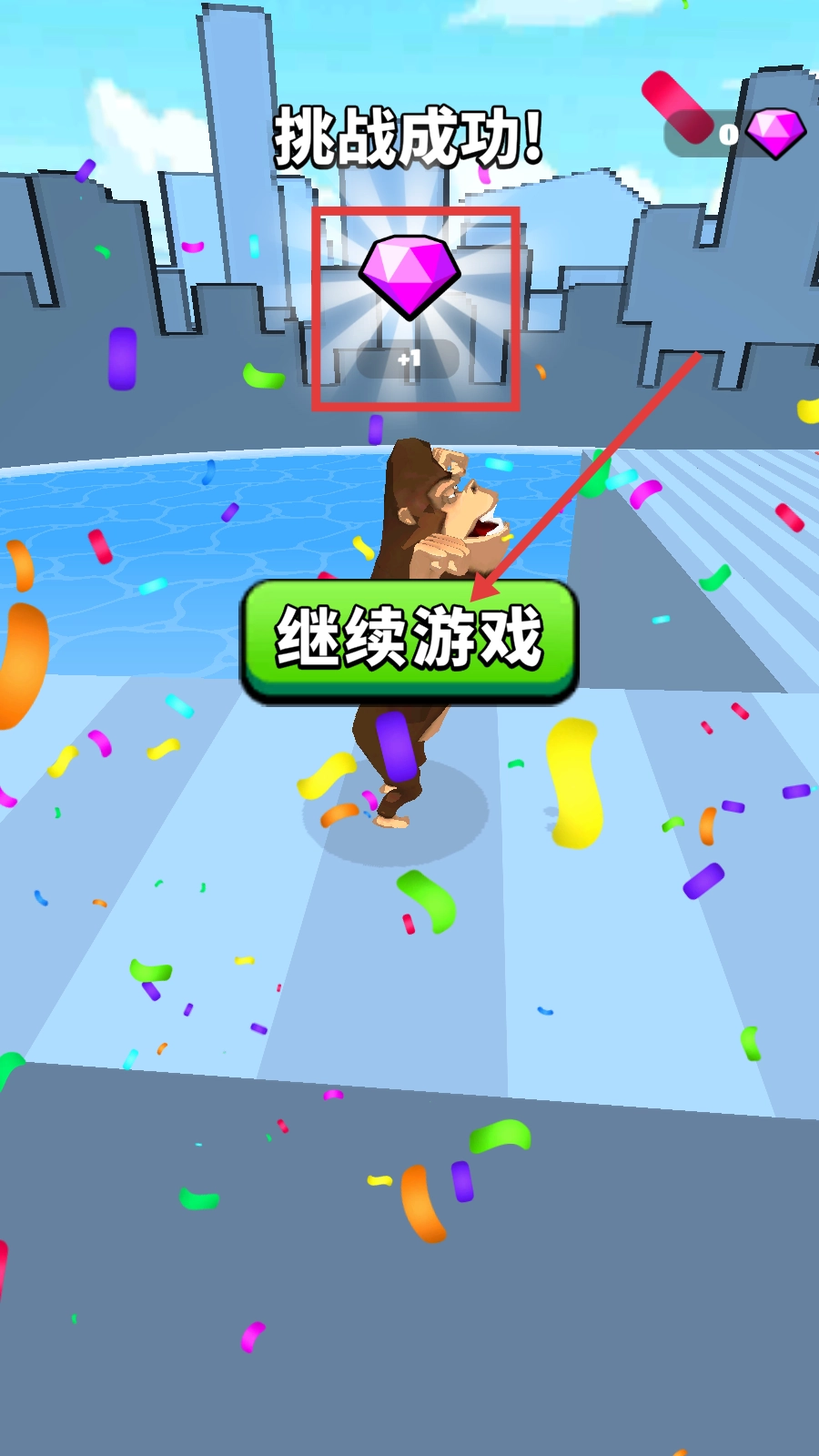 4、挑战成功后,获得【紫色钻石】奖励,点击【继续游戏】,开启下一关挑战积累资源。