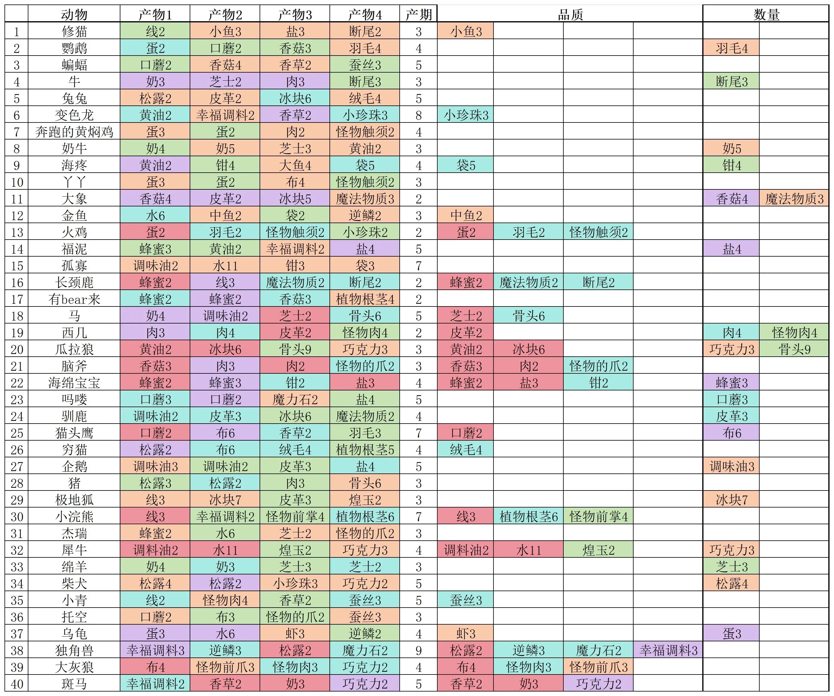 40种动物,每种动物都有不同的产出,材料与动物都可以在探索中获得哦!