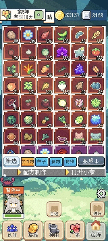 3、点击仓库,点击筛选,依次选择特殊,食物,种子,农作物。把特殊的食谱和卷轴用掉,尽量刷出“水果沙拉”,刷出果酱也可以。因为水果沙拉夏天补体力值翻倍。(PS:每种食物都会有不同的功能,可以着重吃特定季节体力加倍和加体力的)