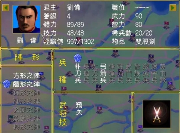 3、刘备:初始武力84,智力80物品:双股剑(该物品武力值+6)