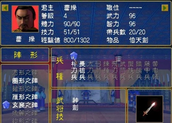 2、曹操:初始武力87,智力96物品:倚天剑(该物品武力直+9