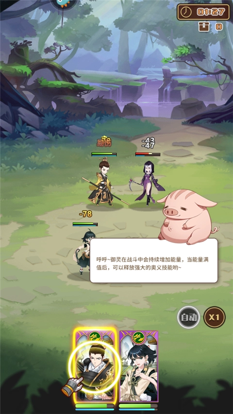 5、之后角色就会自动的战斗,而且御灵在战斗中会持续增加能量,绿色能量条满值后,可以释放强大的奥义技能对敌人造成大范围伤害;