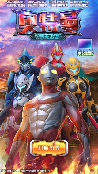 1、打开【奥特曼-钢铁飞龙】的启动界面后,点击界面中间的【开始游戏】按钮就能进入关卡,另外也可以关注右上角的【更多精彩】按钮来浏览额外内容。