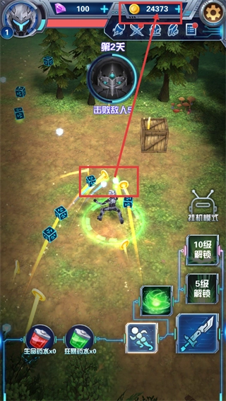 2、处于【第2天】关卡,目标为【击败敌人-10】,右侧有【挂机模式-10级解锁】,底部有道具栏,还可关注【5级解锁】的装备栏。
