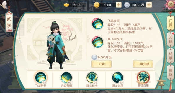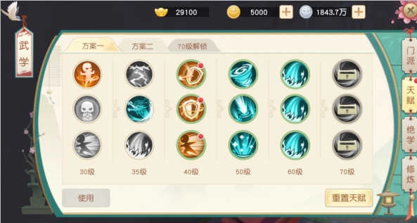每个门派都有极具特色的技能:4个普通技能,4个强化技能,1个终极技能;4个普通技能和4个强化技能一一对应。门派技能随着等级提升解锁,通过消耗银币可以提升单个技能等级。