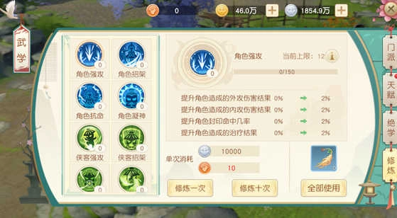 修炼可提升角色、侠客、宠物的百分比属性;修炼上限与人物等级有关。每次修炼会消耗银币、帮贡、秘参、鹿茸、灵芝等。