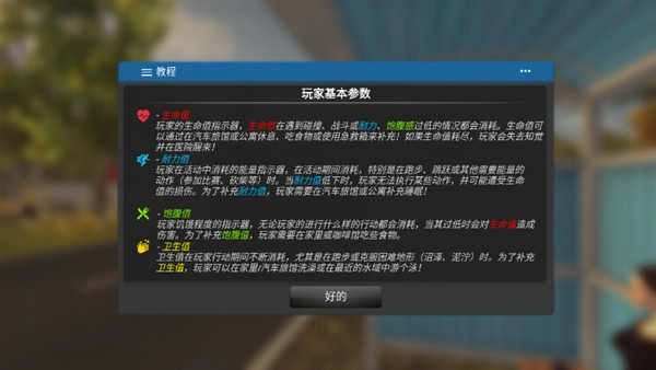 5、正式开始前,先了解一下角色的基本属性:生命值、耐力值、饱腹值和卫生值,这些都要保持良好状态。