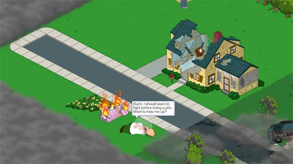 1、恶搞之家》游戏延续了动画原作的故事情节,玩法偏向模拟养成类,依旧保持着无厘头的风格。游戏开场便是火鸡与彼得·格里芬的大战,在这场激烈的交锋之后,当玩家点击救起彼得的瞬间,游戏才正式拉开序幕。