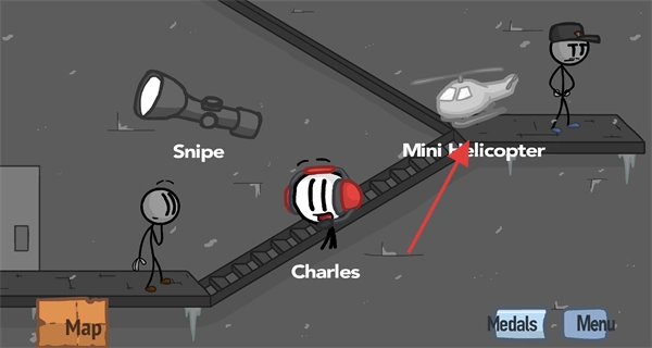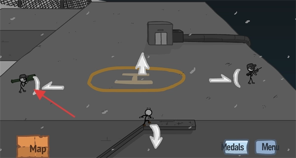 7、顺利到达屋顶之后你会发现有两个武装人员要攻击营救你直升机,最后选择攻击左侧防空兵,让飞机成功抵达位置,完成通关。