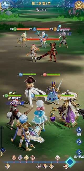 3、在战斗页面,可以点击右边的羁绊查看游戏人物的羁绊情况,也可以点击下方的x2加快战斗速度,当然,如果玩家对战斗非常有信心可以直接点击下方的跳过,直接快速结束战斗。