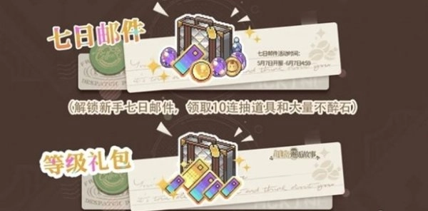 3、七日邮件和免费等级礼包:完成引导和升级,以及登录七日可获取约35抽和400不醉石。