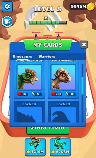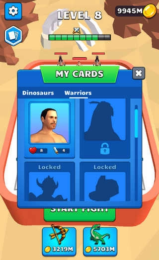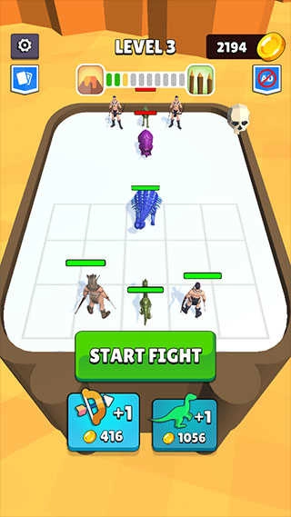 3、界面下方展示了射手与恐龙选项,使用金币购买恐龙或射手,点击“START FIGHT”按钮开始挑战。