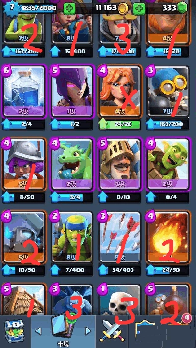 3、目前CR,金币绝对不会过剩,可以用金币在每日商店购买白,橙,紫卡牌;卡牌升级也需要消耗金币,花费只需5,20,50金币的卡牌随意升级。之后,你就需要斟酌,根据你使用卡牌以及主流卡组用到卡牌的情况,有优先级的升级卡牌了。因为后期卡牌升级金币消耗相当高,白卡6-7需要1000,7-8需要2000金币哦!当然这都是后话了。