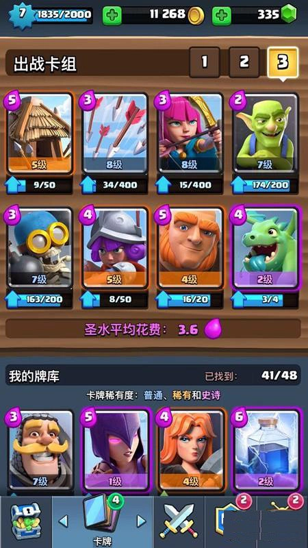 我起手的四张分别是哥布林房子,箭雨,弓箭手,幼龙。可视下张(第五张)是炸弹骷髅。