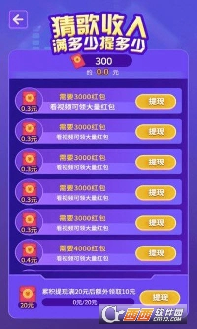 《猜猜什么歌红包版》是一款趣味性十足的手机猜歌类赚钱游戏,游戏内设置了海量关卡,玩家需依据播放的音乐猜出对应的歌曲名称,只要猜对就能获得红包奖励。对这款游戏感兴趣的小伙伴,欢迎通过西西平台体验!