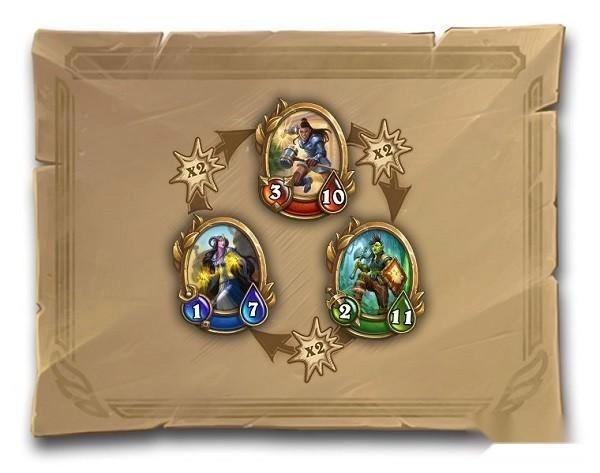 在这个模式里,不同职业间是存在双倍伤害的克制关系的,红色护卫克制绿色斗士,绿色斗士克制蓝色施法者,蓝色施法者克制红色护卫,这种克制存在于所有的技能当中,即不管绿色施法者是用物理技能还是法术技能,都可以对红色护卫造成双倍伤害。