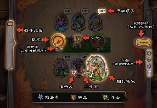如果你在此之前对“佣兵战纪”有所了解,或者已经初步上戏,就会发现里面的卡牌是有红蓝、绿三种颜色区分的,这三种颜色代表着职业,红色护卫、绿色斗士、蓝色施法者,看职业名大家应该大概能知道他们擅长什么。