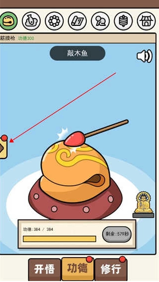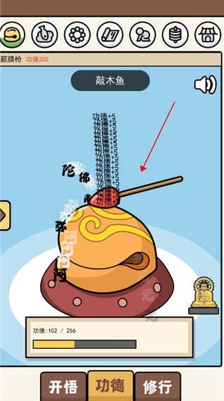 2、点击屏幕任意区域即可完成木鱼敲击操作,开启修行进程。初始状态下,玩家功德值仅为10点,且存在自然衰减机制,需持续操作维持数值稳定;