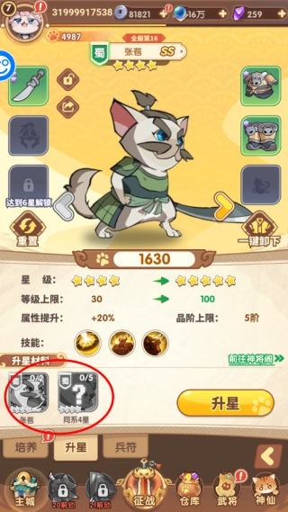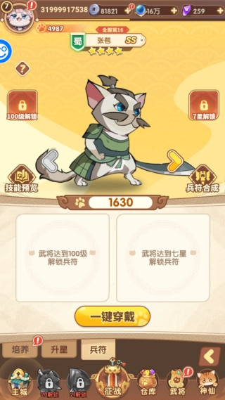 3、进入武将培养界面后,能够对武将进行升级操作,也可以为武将穿戴装备。
