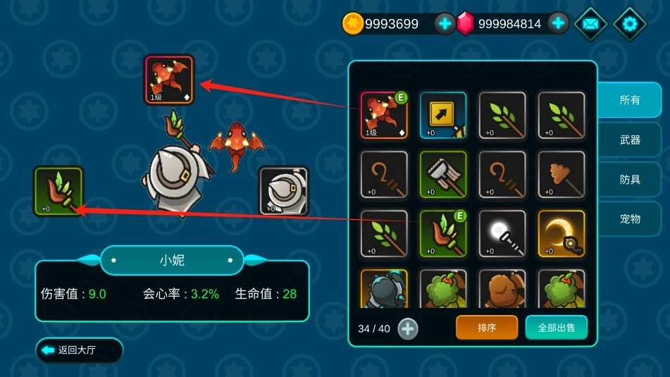4、点击背包,可对武器,宠物,装备上,获得强大的攻击力。