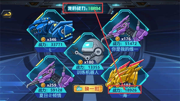 1、查看【我的战力-16694】,对比界面里机甲的【战力】数值,挑选战力匹配的对手,也能点击【换一批】来刷新对手列表。