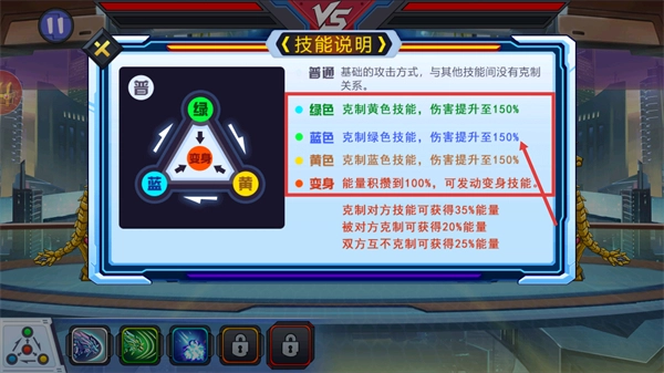2、熟悉【技能说明】中的克制关系:【绿色】克【黄色】、【蓝色】克【绿色】、【黄色】克【蓝色】,释放对应技能可提升150%伤害。
