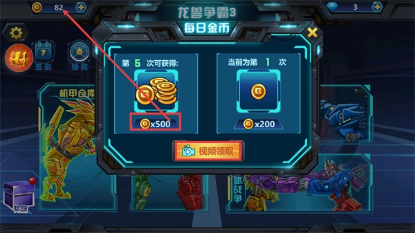 4、在【每日金币】界面,通过【视频领取】获取当前第1次的【200-金币】,累计到第5次可获得【500-金币】奖励。