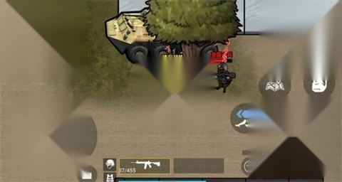 3、与敌人对峙时,借助树木等掩体躲避攻击,同时观察枪械弹药数,在弹药充足时点击右侧 “点击射击” 按钮瞄准敌人,同时利用方向键调整站位避免暴露。