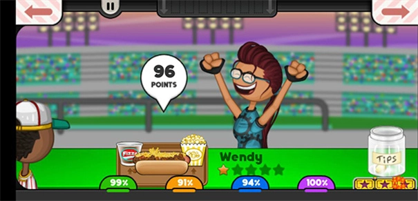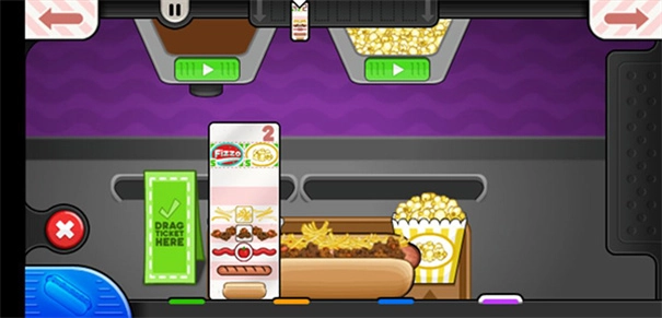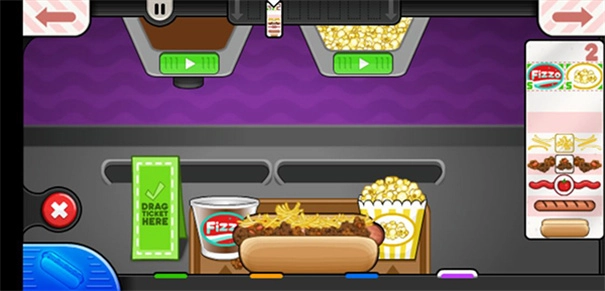 2. 玩家努力卖好吃的热狗,赚钱扩大店面,解锁饮料、爆米花等商品;