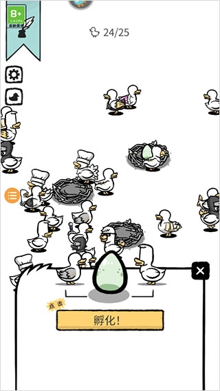 1、采用黑白画风设计的鸭子闯关游戏,你能在鸭子的全新世界里,孵化出更强大的鸭子。