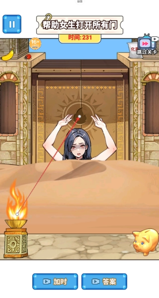 3、使用“锤子”将存钱罐打碎,会出现金币,将金币放在门上,打开第三道门。
