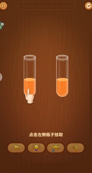 1、进入先熟悉操作,点击装有水的容器,再点击目标容器即可倒水,初期关卡先观察,找到最容易归位的水,优先操作。