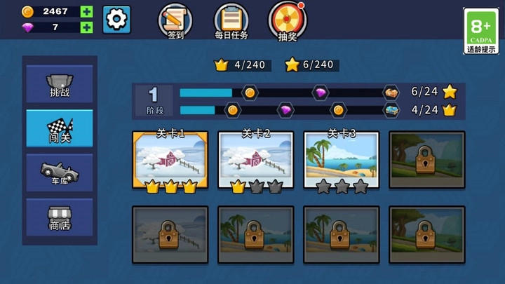 1、通过完成基础难度挑战逐步解锁更高级别的赛道,同时还有限时模式、竞速模式等多种额外玩法可供尝试。