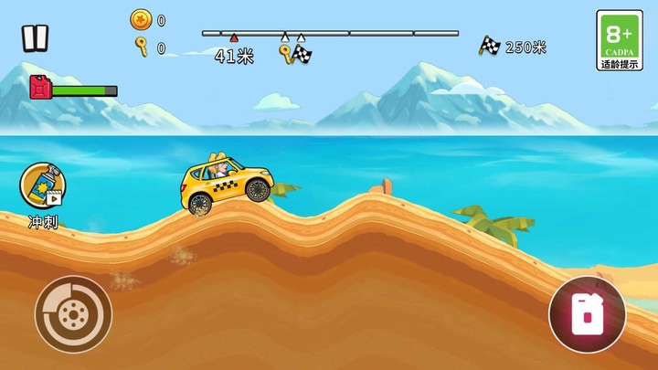 2、操作飞车的方法也很简单,通过控制手机的屏幕上左右两边按钮来控制登山车的开车 速度和方向。