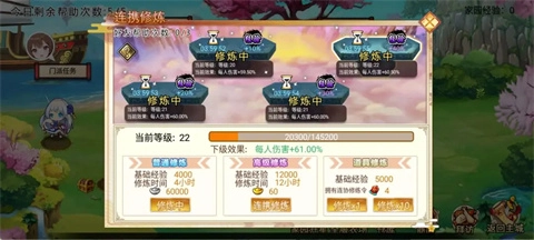 4、连协修炼。天道九级需要连协总和100级。小技巧:四个修炼每个间隔五分钟,当第一个修炼结束,234还在修炼的时候,修炼1依旧是最高倍率,卡点修炼可保持每个位置都是最高倍!
