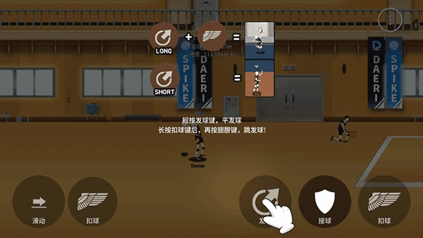 5、发球也有一定的技巧,长按发球键是平发球,长按扣球键再按翅膀键则是跳发球,玩家可以根据站位进行选择,可玩性很强;
