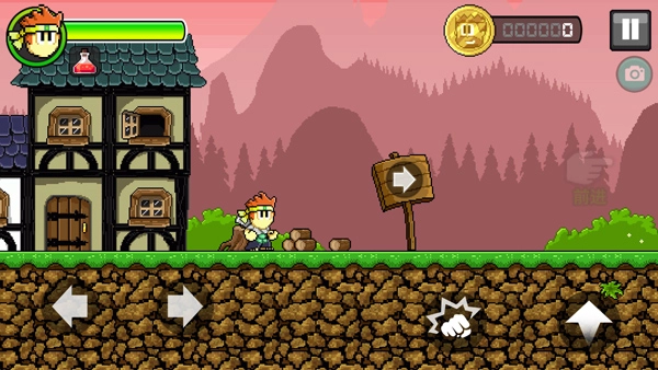 3、左下角的两个按键能够控制角色左右移动,右下角的两个按键分别是普攻,以及跳跃。