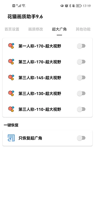 切换游戏版本、启动游戏、闪退修复、一键恢复所有画质(包括超广角)