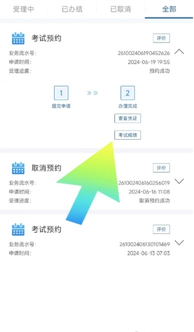 3、在“全部”页面中,找到你预约的考试信息。点击该信息,会展开详细的预约详情。在这里,你可以看到考试的时间、地点、科目等信息。找到预约详情中的“考试成绩”一项,点击进去。这时,系统会自动显示你的考试成绩,包括各科目的分数和总分。如果你顺利通过了考试,那么恭喜你,离拿到驾驶证又近了一步。