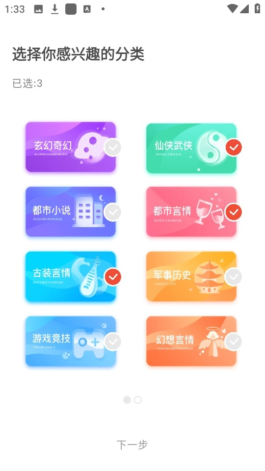 2、接着自定义选择自己感兴趣的分类小说,点击下一步。