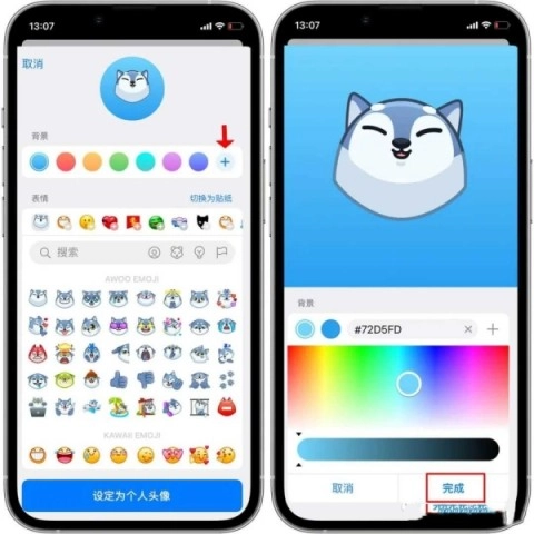2、点击【+】号来选择更多颜色,选定背景色后别忘了点击【完成】以确认。
